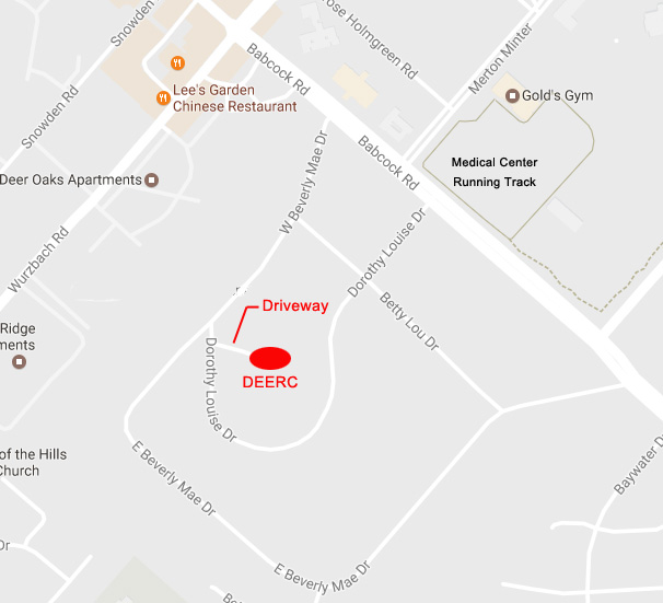 Take exit 14B from Loop 410 onto Babcock Road. Travel approximately 1.2 miles northeast (outside Loop 410). Turn left onto Dorothy Louise Drive. Stay on Dorothy Louise Drive as it curves around to connect with West Beverly Mae. Right before you get to West Beverly Mae, you will see a gravel driveway between two houses on your right. The driveway leads to the DEERC Property. We recommend that you park on the street and walk up the driveway to the property. There is limited space for parking and we will want most of the open space on the property to be available so we can spread out with our furry friends.